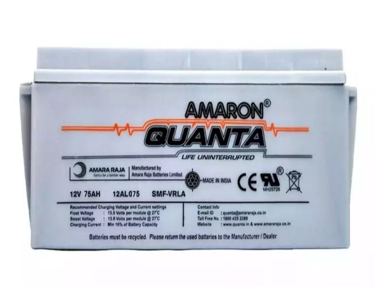 Amaron Quanta 75AH, 12V SMF - Sealed Maintenance Free, VRLA (Valve Regulated Lead Acid) battery for UPS applications is built to perform. In short, the lifeline to your UPS applications. AMARON QUANTA TM is a product of fail- safe, fool-proof battery technology, produced and tested in our premier manufacturing facility. Amaron Quanta has a broad range of SMF batteries specifically designed for UPS application.