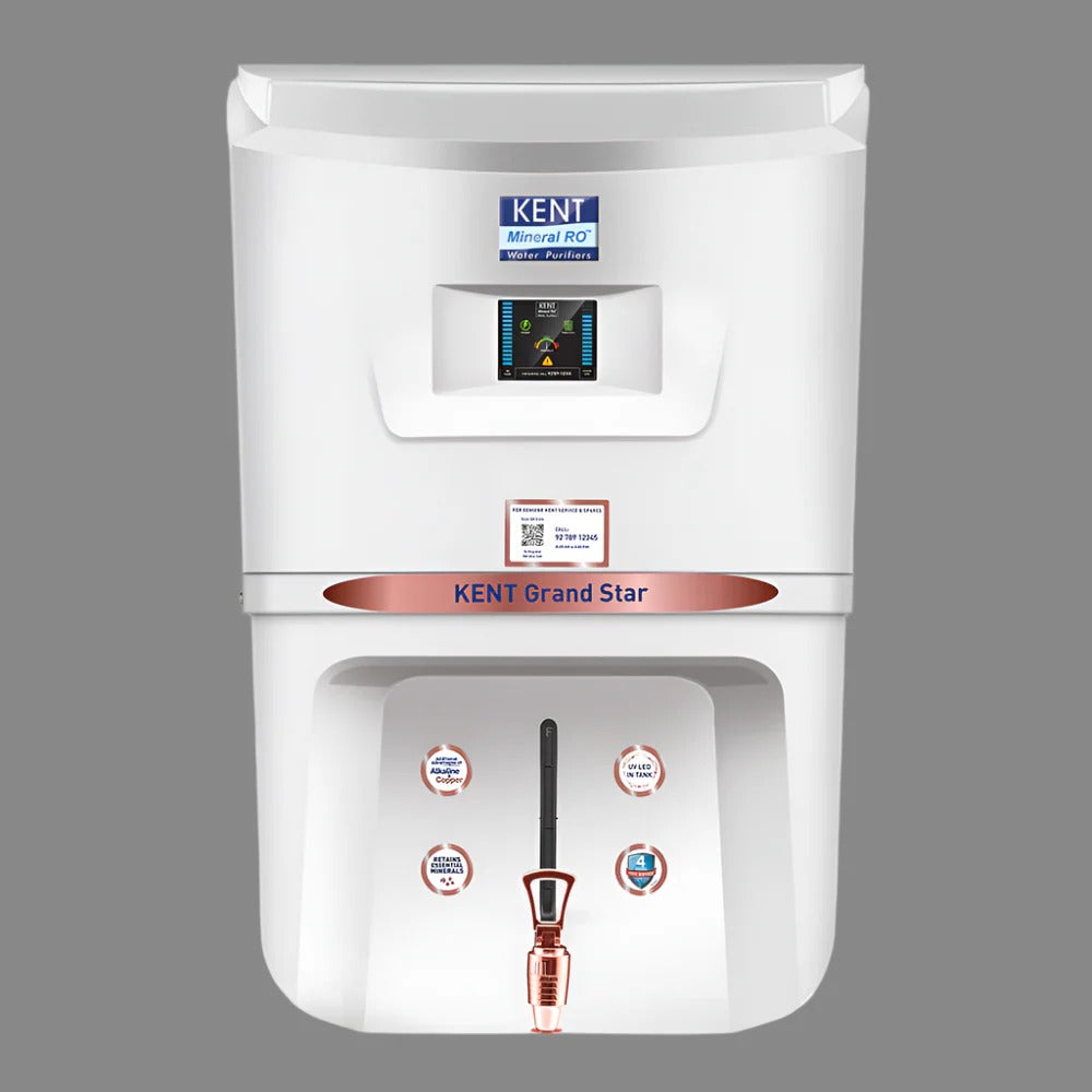 KENT Grand Star, Now drink pure and mineral-rich purified water with KENT Grand Star, an advanced RO water purifier with multiple purification process of RO+UV+UF+TDS Control+Alkaline+Copper+UV In-tank, and Zero Water Wastage Technology. It enhances water with an alkaline pH of 8.0+ while delivering the natural benefits of Copper. This purifier comes with a unique Digital Display of Purity feature that allows real time monitoring of purified water quality, filters life, RO flow rate etc. Also, the Mineral ROTM technology helps retaining essential natural minerals in the purified water. Best suited for Indian homes and offices, KENT Grand Star is ideal for purifying brackish, tap and municipal corporation water.