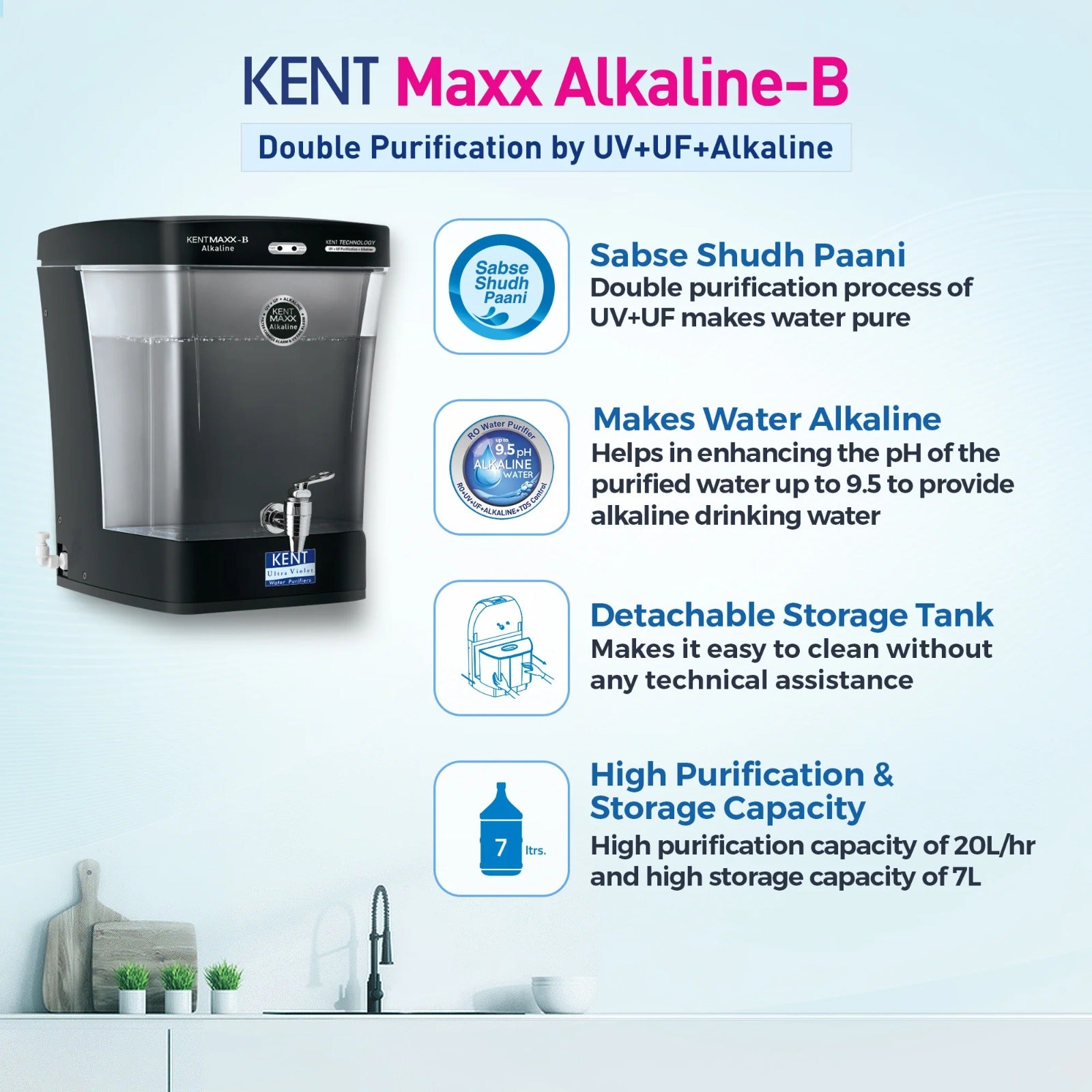 Kent Maxx Alkaline UV Water Purifier (111149B) 7L Storage Tank UV+UF+ Alkaline Double Purification
