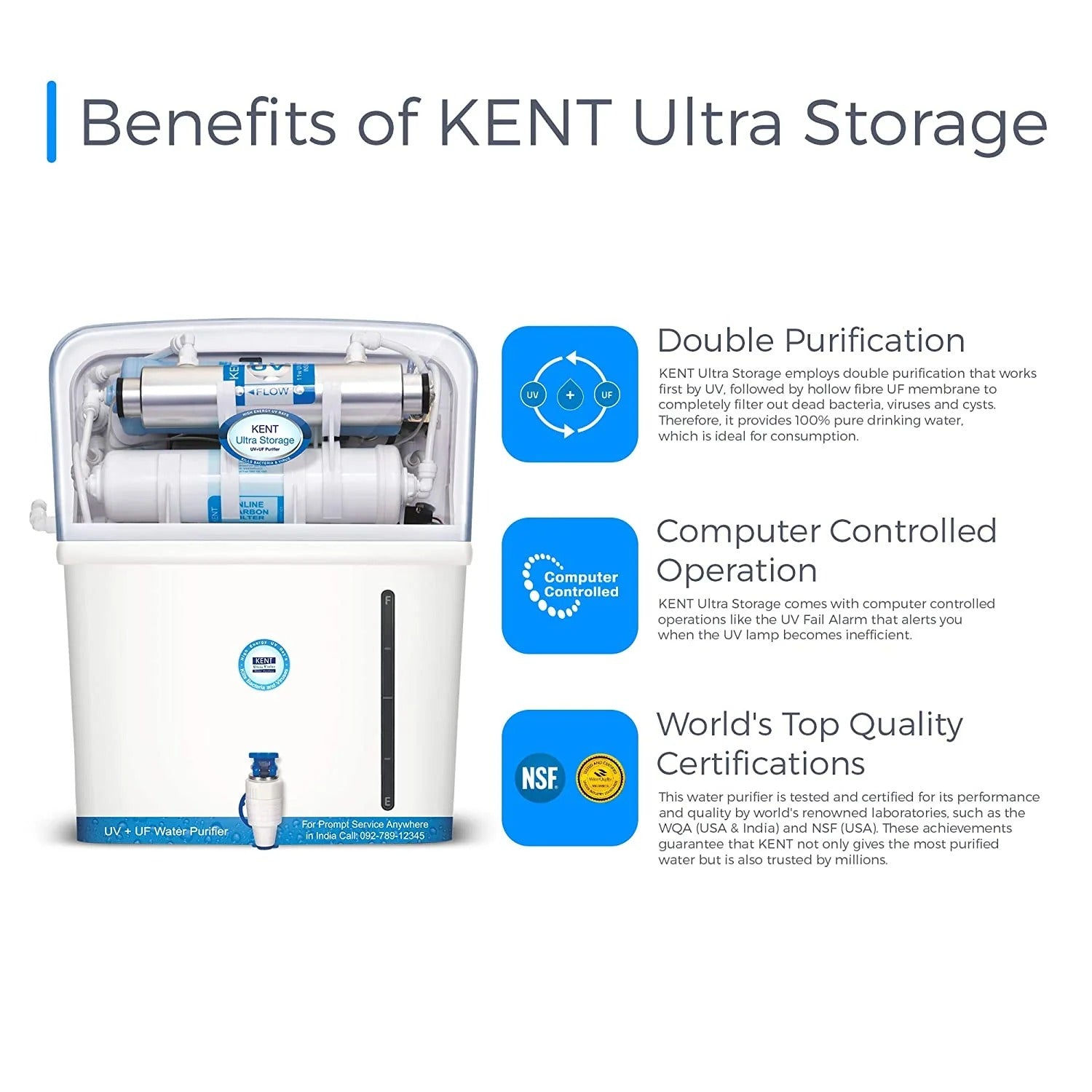 KENT Ultra Storage, The new advanced fully automatic UV water purifier with storage tank that provides multiple purification first by UV followed by hollow fibre UF membrane. This purifier is designed for wall-mounting, best suited for tap/municipal water supply and domestic purposes.