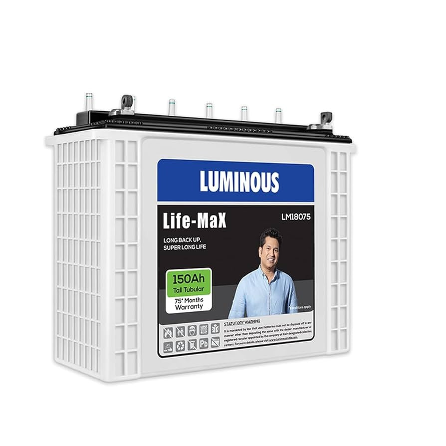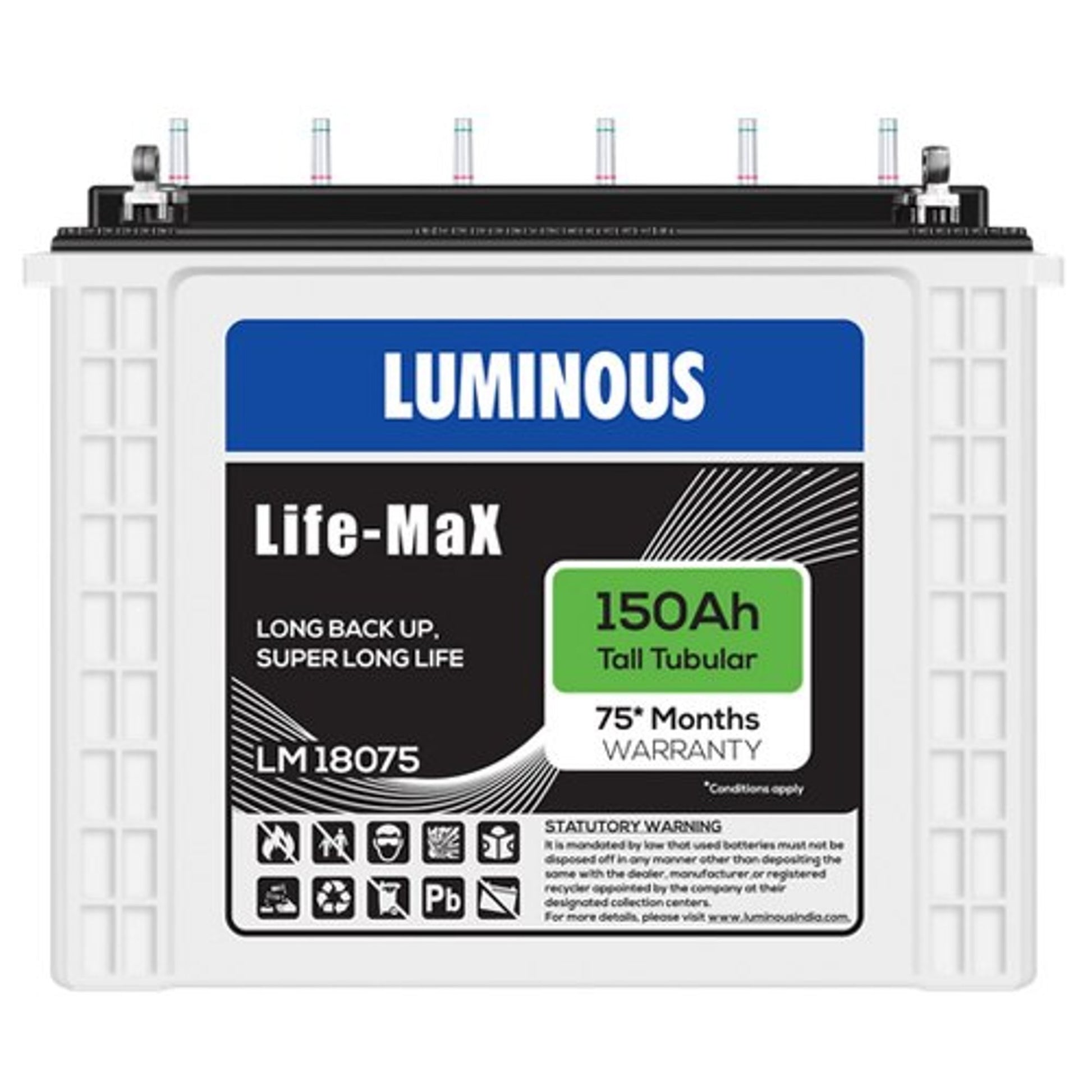 Luminous 150AH Life Max LM18075 Tall Tubular Inverter UPS Battery@ C20 Rating Rechargeable & Recyclable batteries are next generation Tall Tubular batteries which are designed to withstand long and frequent power cuts for Home, Office, shops use.