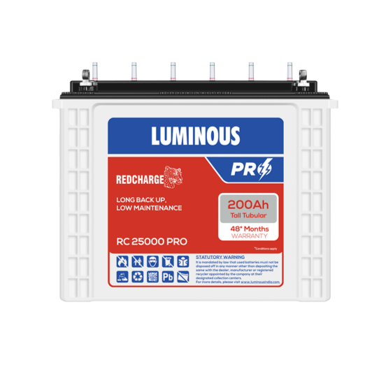 Luminous Red Charge 200AH, 12V Tubular Battery for Inverter UPS RC 25000 @ C20 Rating Inverlast Tall tubular range of batteries are next generation Tall Tubular battery, The ultimate tall tubular batteries especially designed with thick tubular plates are best suited for areas with frequent power cuts.
