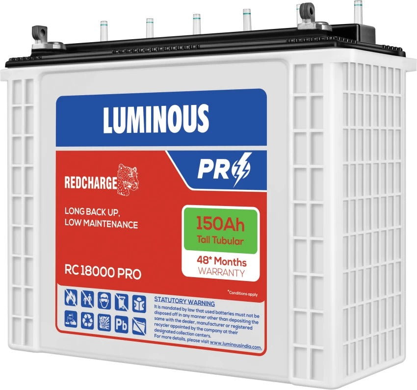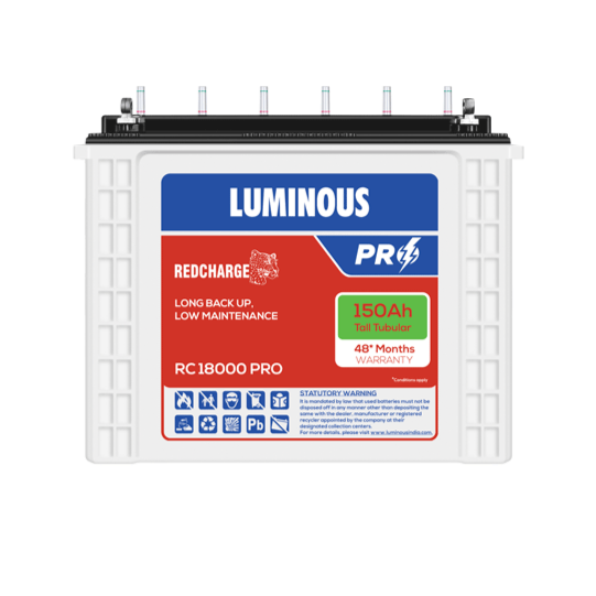 Luminous 150AH Red Charge RC18000 Pro Tall Tubular Inverter UPS Battery@ C20 Rating Rechargeable & Recyclable batteries are next generation Tall Tubular batteries which are designed to withstand long and frequent power cuts for Home, Office, shops use.