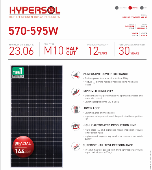 Vikram Solar Panel 585 watt Topcon NDCR, Topcon bifacial solar panels represent cutting-edge photovoltaic modules engineered to harness sunlight from both their front and rear surfaces. Incorporating N-type TOPCon (Tunnel Oxide Passivated Contact) technology, these panels deliver exceptional efficiency and performance even in elevated temperature settings. Hypersol, the latest PV module from Vikram Solar is powered with N-Type cells with higher efficiency. Improved longevity, excellent anti-PID performance via optimized process & materials control and lesser susceptibility to LID & LeTID, Hypersol modules are an amalgamation of endurance and agility, a fusion of quality and performance, a blend of balance and flexibility.